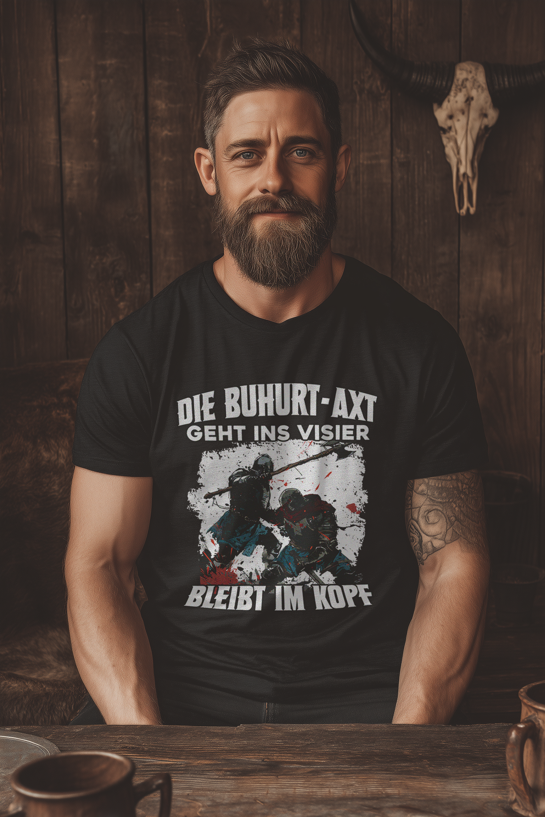 Dieses Buhurt Shirt ist nichts für Zartbesaitete: Ein epischer Buhurt-Kampf mit der Axt als Highlight. Zwei gerüstete Kämpfer prallen mit voller Wucht aufeinander – im Mittelpunkt eine massive Streitaxt, die genau das ausdrückt, was der Slogan verspricht: