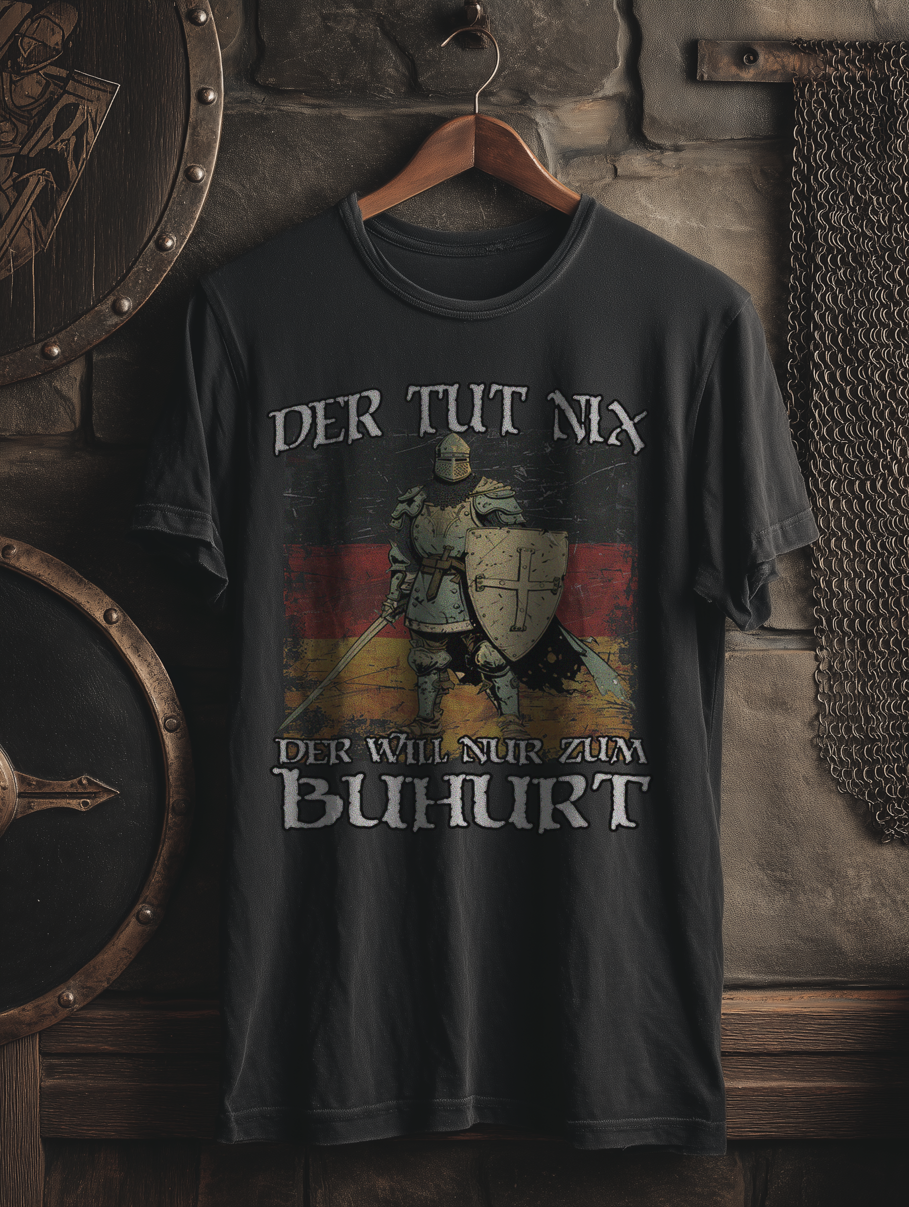 Zeige mit diesem markanten Shirt deine Leidenschaft für Buhurt: „Der tut nix, der will nur zum Buhurt“. Das Design zeigt einen vollgerüsteten Ritter mit Schwert und Kreuz-Schild vor der deutschen Flagge im abgenutzten Vintage-Stil – ein starkes Motiv für alle, die Vollkontakt im Mittelalter lieben.