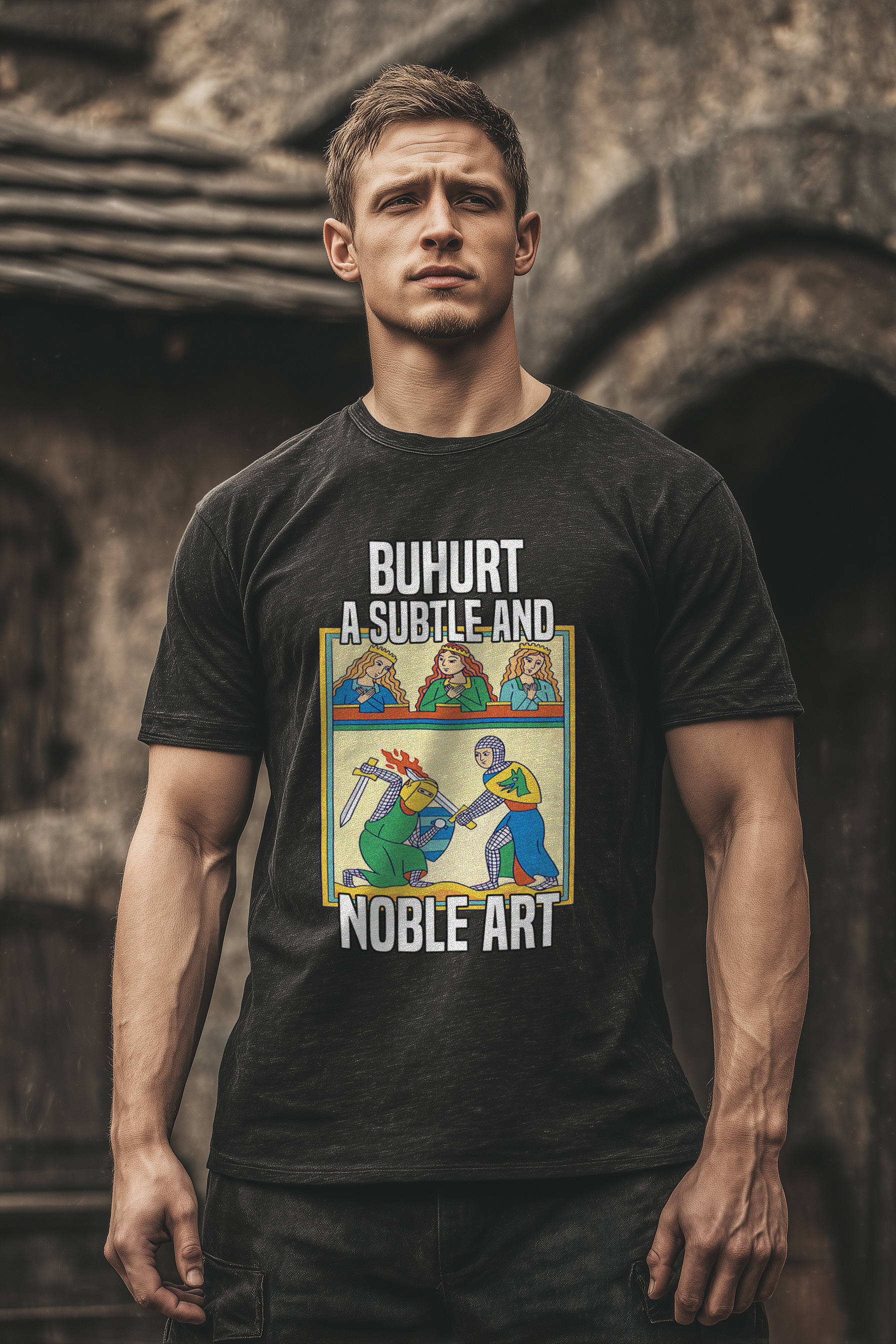 Ein Buhurt Premium T-Shirt was für sich selbst spricht. Entschlossene Kämpfer im Zweikampf unter den sensationslüsternen Augen der Hofdamen. Der schwarze Humor dieses Motivs könnte nicht passender umschrieben werden als mit dem Spruch " Buhurt eine edle und subtile Kunst" während einem Ritter der Helm ausgebeult wird. Das Perfekte Geschenk für alle Fans von HEMA, LARP und Buhurt Athleten