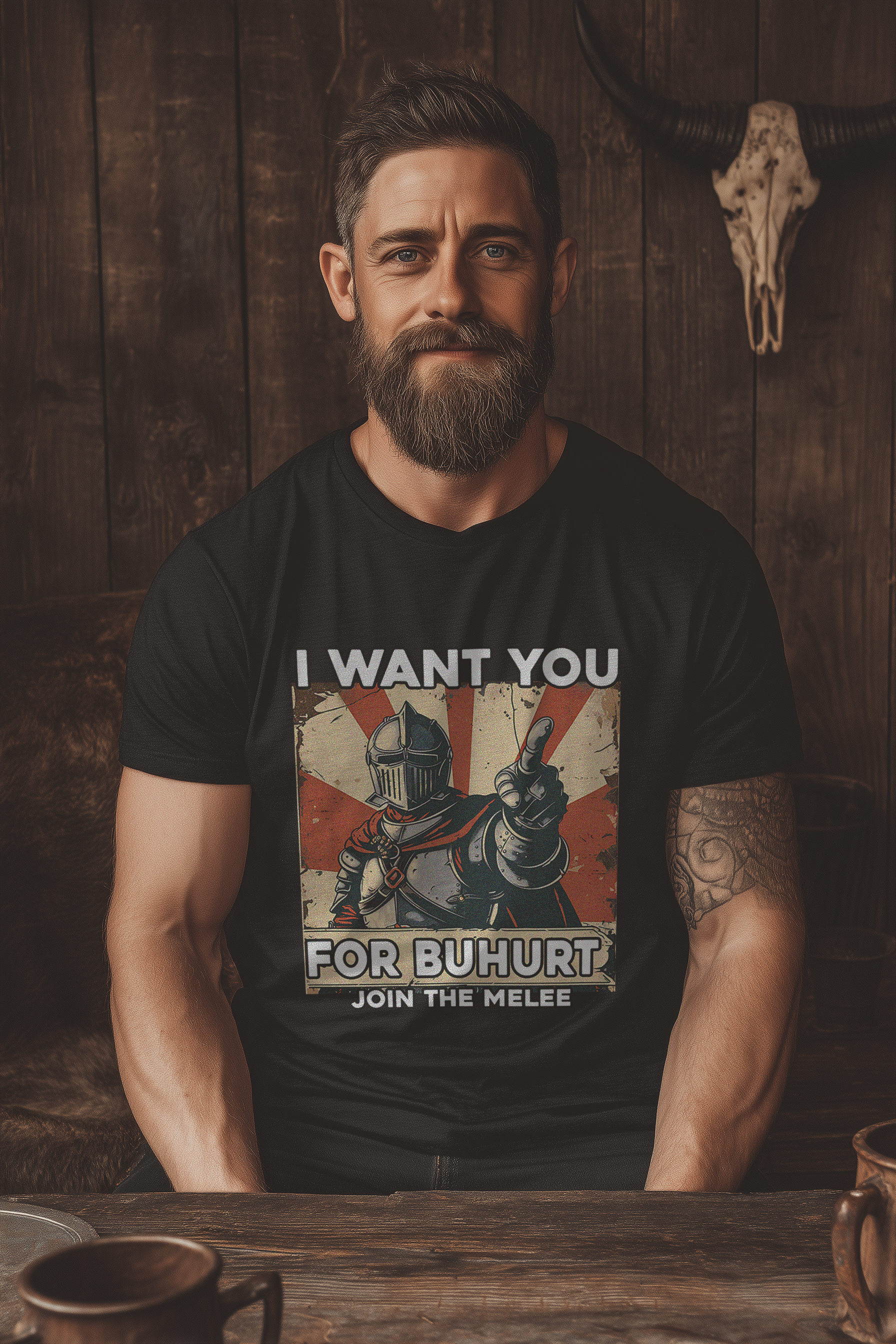 Mach mit im Nahkampf! Dieses Premium Herren T-Shirt im amerikanischen Propagandastil zeigt einen Ritter im Uncle Sam Look, der dich direkt auffordert: „I want you for Buhurt – join the melee“.