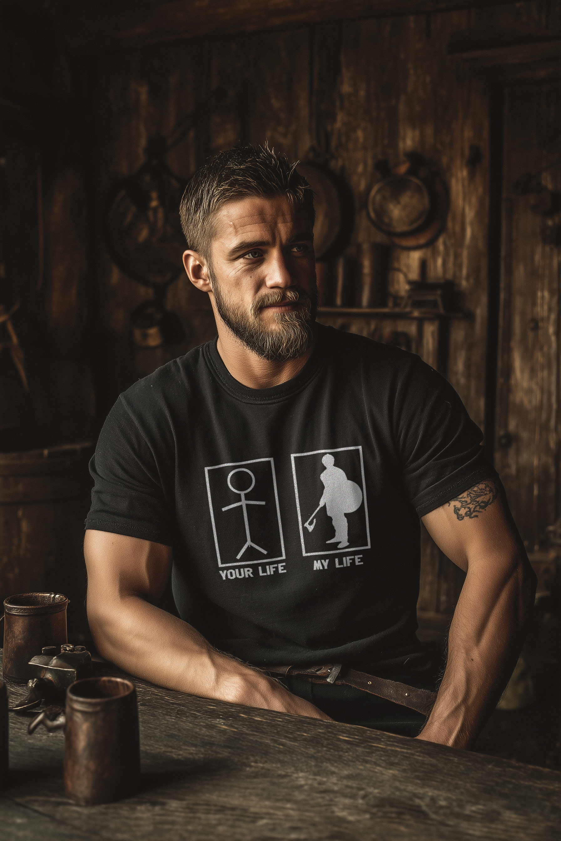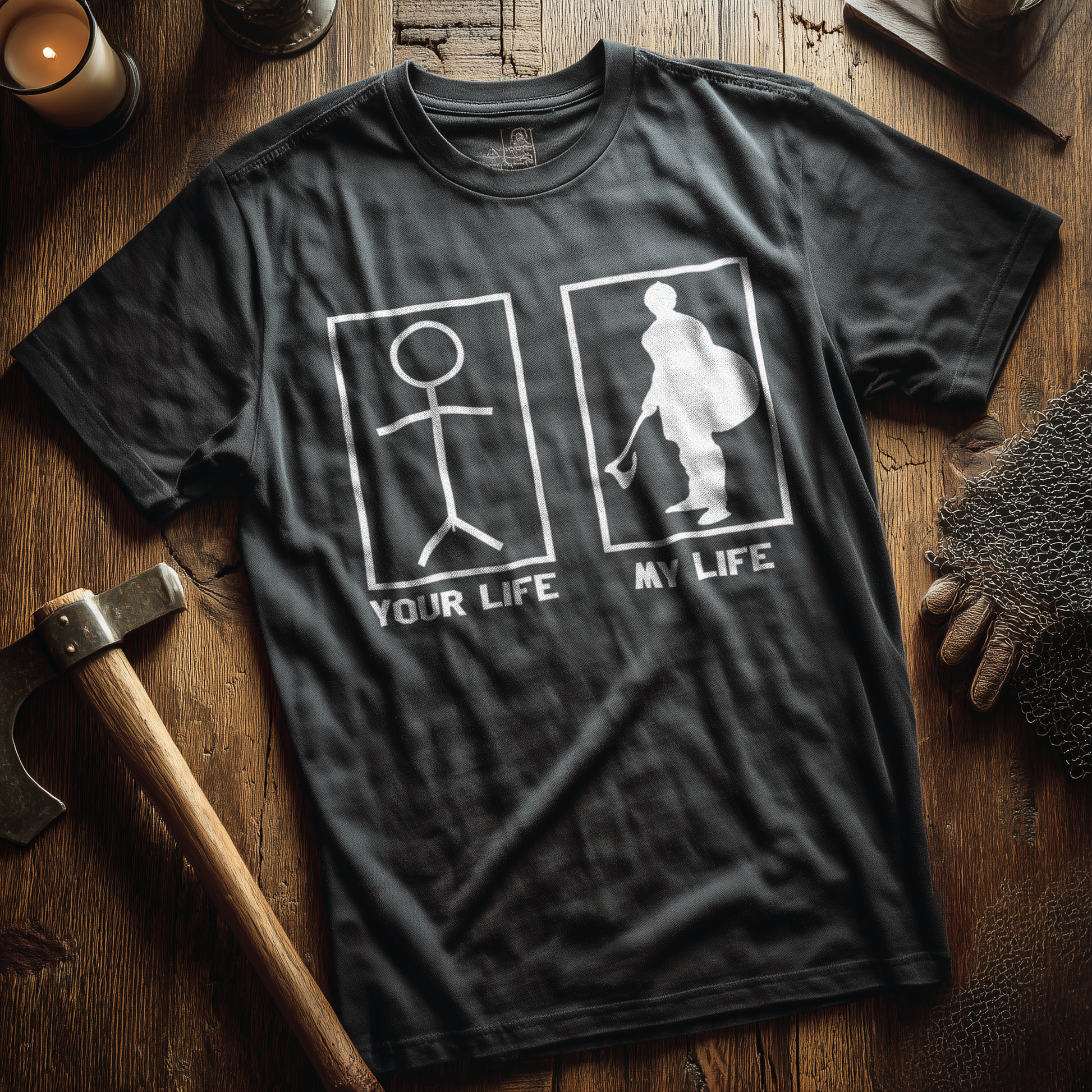 Mit diesem Buhurt „Your Life – My Life“ Herren Premium T-Shirt zeigst du auf einen Blick, dass dein Alltag nicht aus Netflix und Couch besteht, sondern aus Stahl, Schweiß und einer ordentlichen Portion Adrenalin.